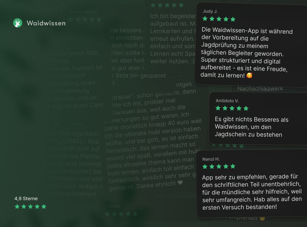15.000+ Fragen, Prüfungssimulation, Tipps & Erklärungen. Plus digitale Bibliothek statt teurer Bücher. Garantiert zur schriftlichen Jägerprüfung.